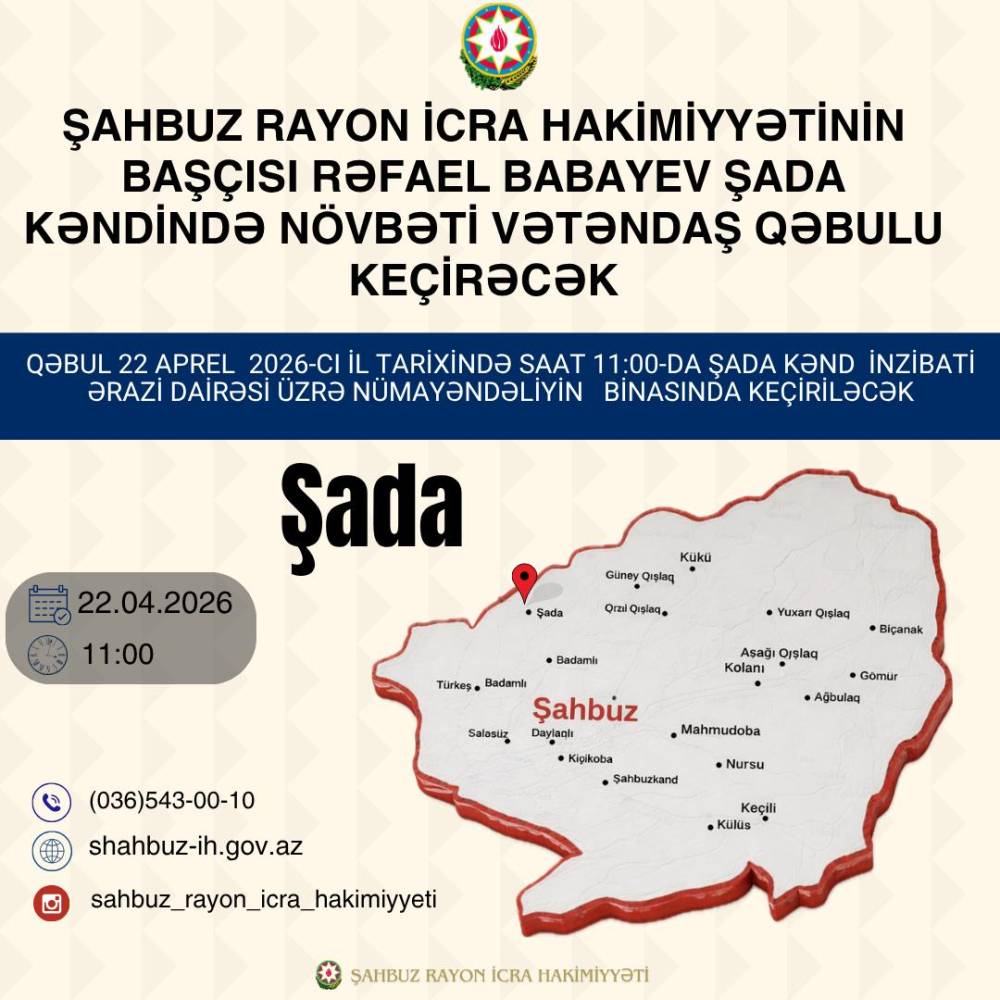 Şahbuz Rayon İcra Hakimiyyətinin başçısı Rəfael Babayevin 2026-ci ilin mart ayında keçirəcəyi səyyar...
