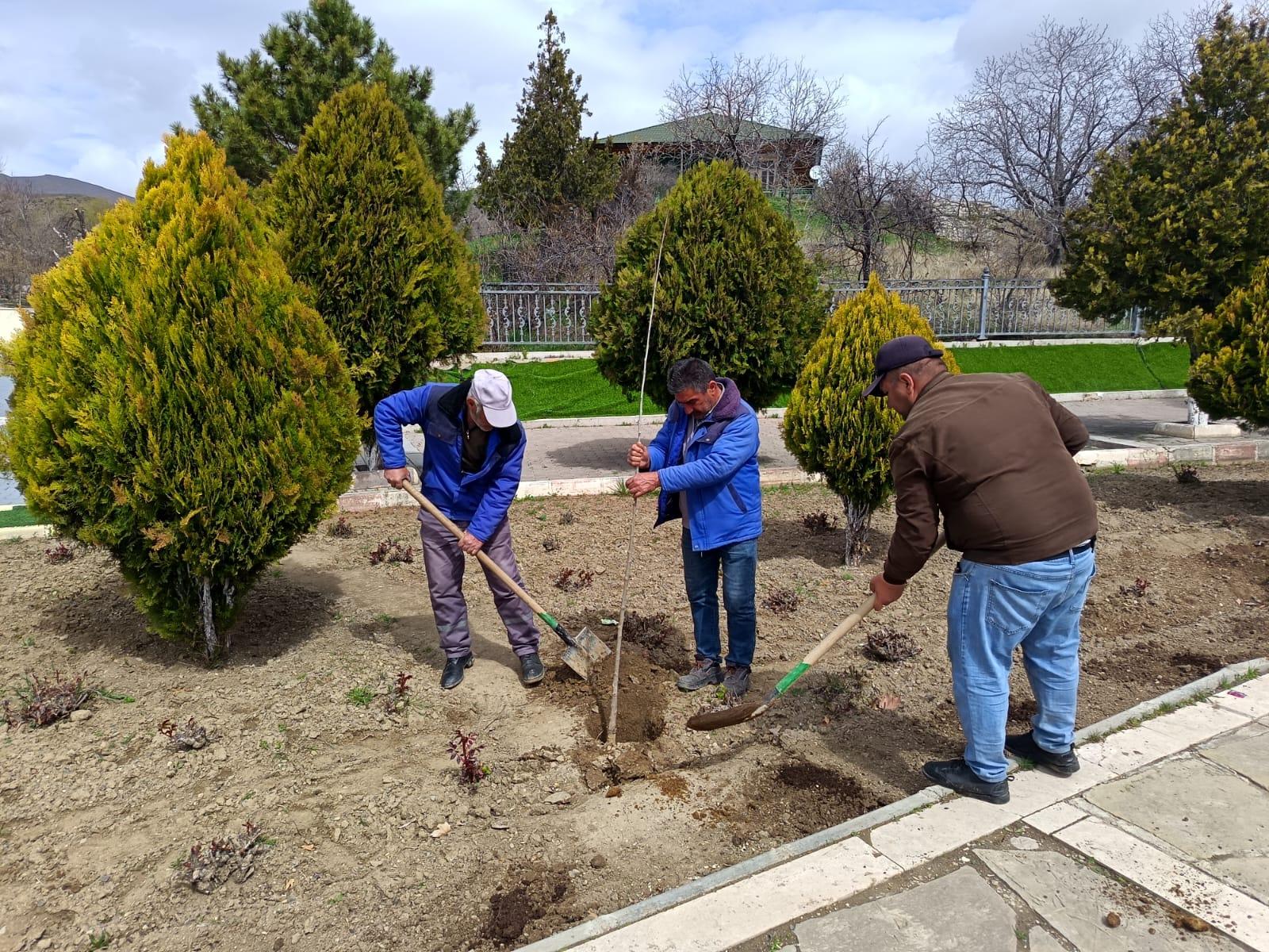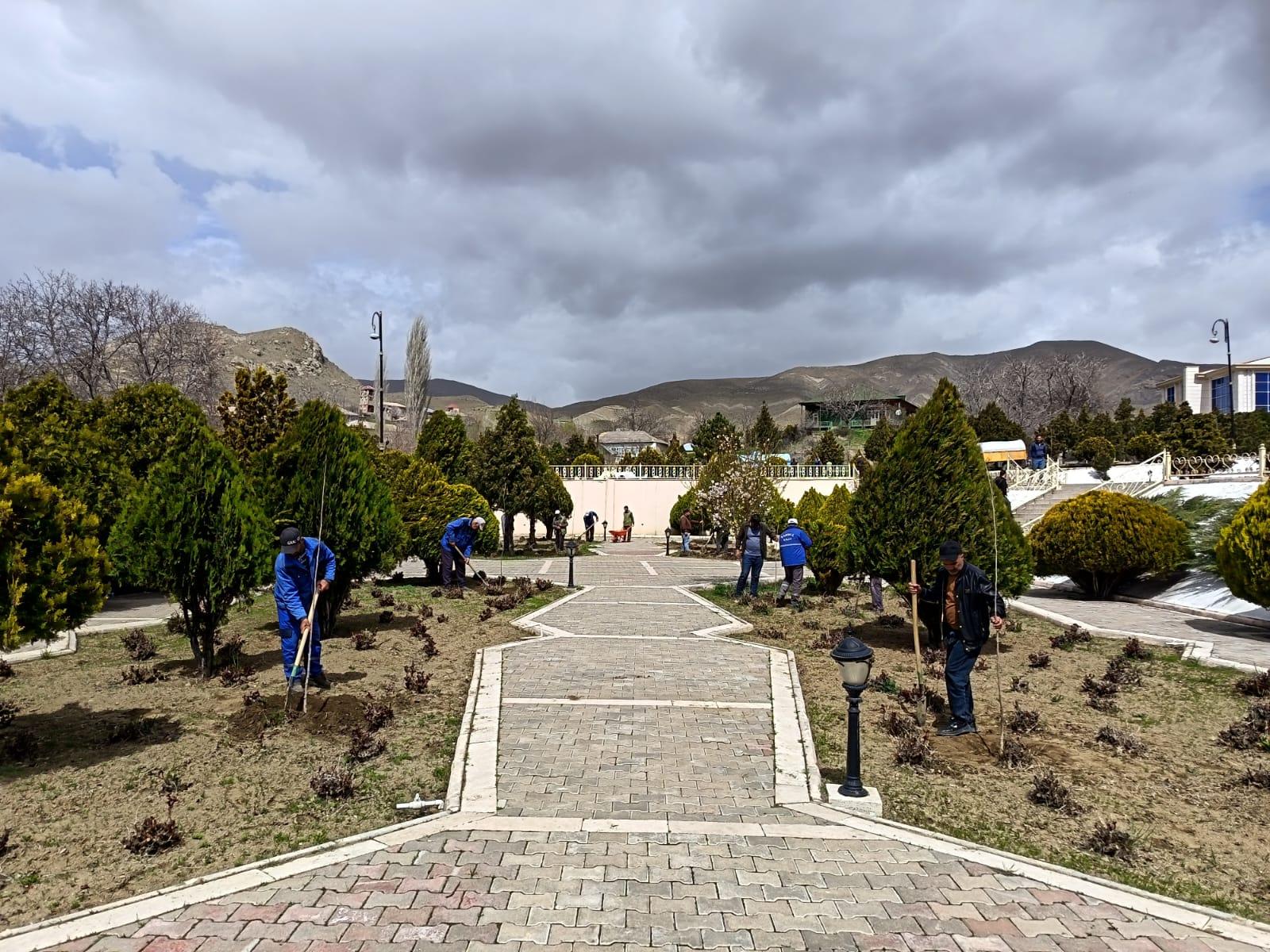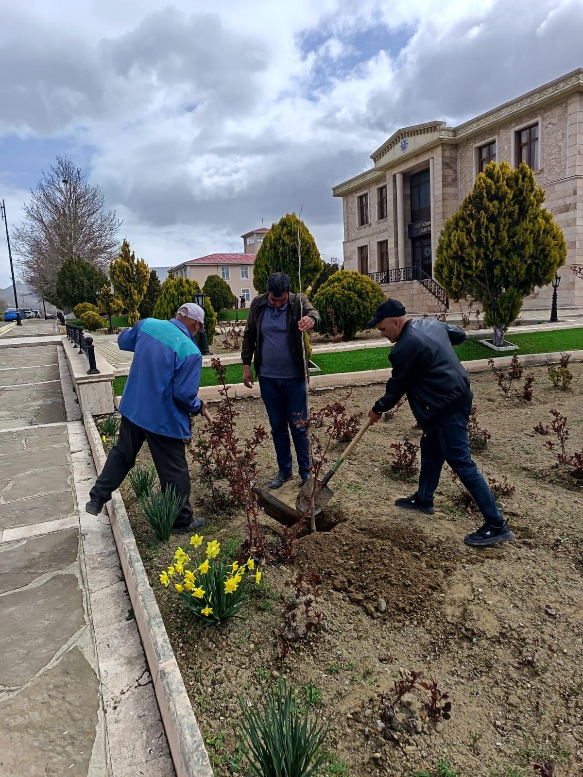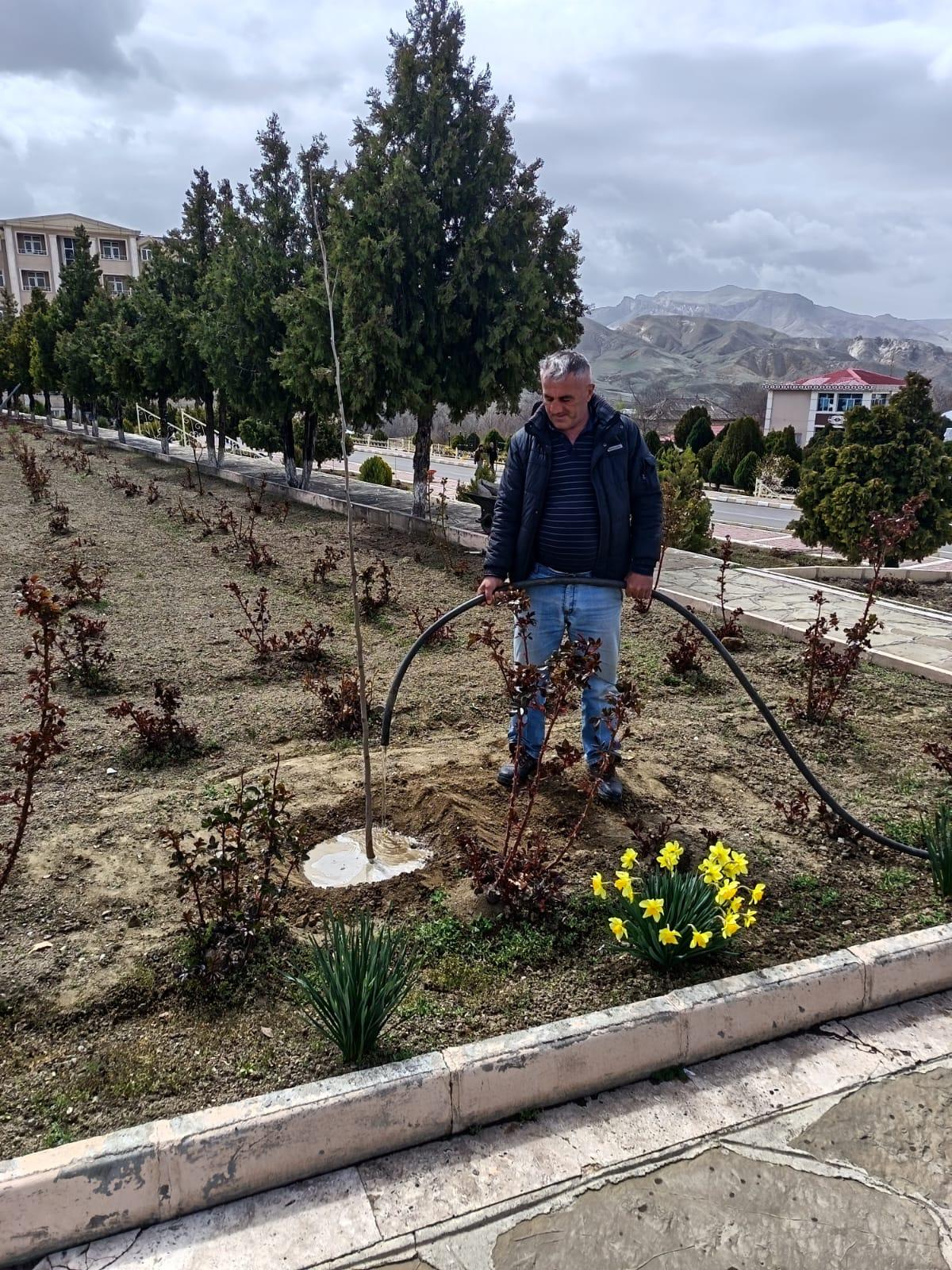 Əkilən ağacların gövdələri zərərvericilərə qarşı xüsusi məhlulla ağardılıb və suvarma işləri aparılıb.